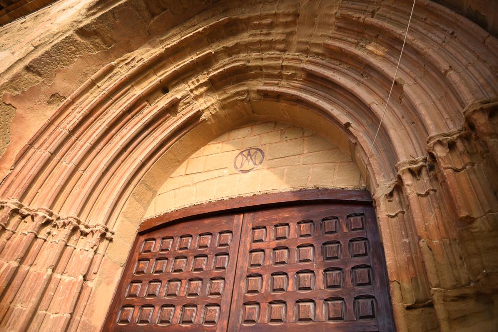 - En su muro se abre una hermosa puerta abocinada, enmarcada por dos contrafuertes, declaradamente gótico por la fina moldura de las cinco arquivoltas apuntadas y de las columnillas. Esta portada parece ya de los siglos XIV o XV, lo cual nos da una pauta para fecha la ampliación de la iglesia, en tanto que la primitiva parece de mediados del siglo XIII, no dejando de sorprender que aquella se construyera deliberadamente arcaizante para armonizar con la antigua.”