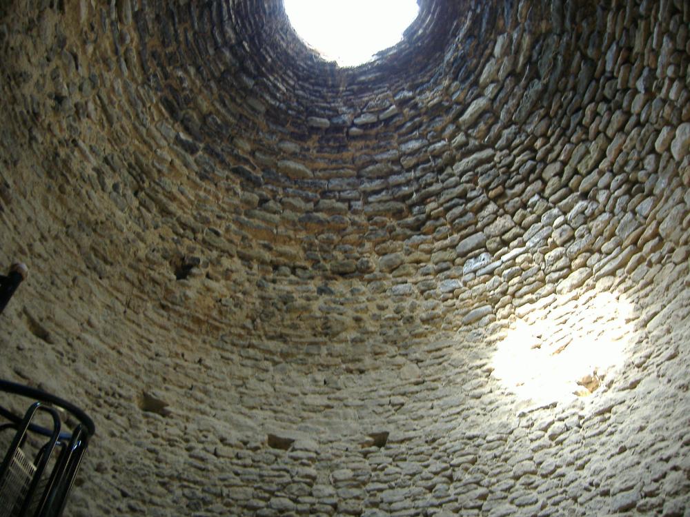 - Es un aljibe cilíndrico, cubierto superiormente con una cúpula de gruesos (unos 70 cm. de espesor) muros de mampostería. Su diámetro es de 6 m y su altura supera los 11 m. Se cubre con una cúpula de la misma piedra que las paredes, teniendo una abertura en la parte superior, hoy cerrada con un forjado y una capa de hormigón. Encontrándose enterrado en el cerro, tiene a media altura un acceso a través de una cueva. En esta situación, era sencillo mantener las condiciones adecuadas para la conservación del hielo.